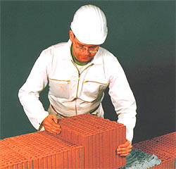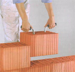 Die zur Wahl stehenden Mauerwerkssysteme für Profis und Selbstbauer.1. Poroton-T_Planziegel für TauchverfahrenBauen mit dem Poroton-Planziegel bedeutet natürliches Bauen. Der verwendete Ton wird in seiner Reinheit belassen. Poroton-Ziegel werden ganz ohne chemische Bindemittel produziert. Sorgfältige Verarbeitung mit moderner Technik und strengen Kontrollen sichern eine gleichbleibend hohe Qualität. Mit dem Poroton-Planziegel haben Sie die Grundlage für ökologisches und ökonomisches Bauen.Der Poroton-Planziegel sichert mit dem Tauchverfahren ein einfaches und rationelles Hochziehen eines Mauerwerks. Nach dem Versetzen der ersten Lage auf einer Ausgleichsschicht aus normalem Mörtel geht der Rest im Handumdrehen: Tauchen, setzen, fertig! Allein die erste Schicht muß exakt lot- und waagerecht ausgerichtet sein, da die folgenden Schichten kaum einen weiteren Ausgleich erlauben. Bei der zweiten Schicht wirde der Poroton-Planziegel einfach kurz in den Dünnbettmörtel getaucht. Der Mörtel haftet fest an der plangeschliffenen Lagerfläche. Jetzt wird der Planziegel einfach in die Verzahnung des Nachbarziegels gesetzt und fertig. Zu beachten ist, daß im Verband gemauert werden muß, d.h. die Stoßfugen der übereinanderliegenden Schichten müssen um mind. 10 cm versetzt sein. So wird in kurzer Zeit ein homogenes, fugenloses Mauerwerk sauber und normgerecht errichtet. 2. Poroton-TE- und T-Blockziegel mit ca 12 mm Mörtel in der LagerfugeBeim Poroton-Blockziegel wird der Mörtel wie üblich mit der Kelle oder aber einfach mit dem Mörtelschlitten in ca. 1,2 cm Dicke aufgetragen.Wie auch der Poroton-Planziegel besitzt der Poroton-Blockziegel eine Verzahnung, in die der Stein eingeführt wird. So wird er auf das Mörtelbett gesetzt und angedrückt, dann lot- und fugengerecht in die endgültige Lage gebracht. Auch hier gilt der Versatz von ca. 10 cm pro Lage. Im Gegensatz zur Planziegelmauer ist bei der Blockziegelmauer die 1,2 cm starke Mörtelfuge in der Lagerfuge zu sehen. Die Bauweise mit Tonziegeln gilt als ideale Mauerwerkskonstruktion. Dies sowohl für die einschalige Bauweise (Mauerwerk und Putz) als auch für die zweischalige Konstruktion (Hintermauerwerk in Verbindung mit einer Vormauer aus Verblendern). Wer so baut schafft beste Vorraussetzungen für ein natürliches, rundum gesundes Raumklima und sichert die Wertbeständigkeit des Hauses über Jahrzehnte hinaus.