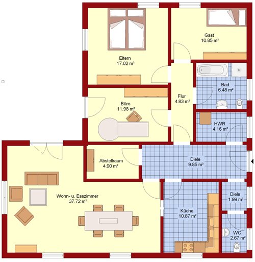 Rund um die Diele sind alle Zimmer und Bereiche übersichtlich angeordnet. Auf der linken Seite befinden sich Küche, Ess- und Wohnzimmer, sowie eine Garderobe und ein Gäste-WC. Ausserdem gibt es einen zusätzlichen Abstellraum, der von der Diele aus zu betreten ist. Als wichtige Ergänzung erhält dieser Entwurf noch einen Hausanschlussraum für die Haustechnik.