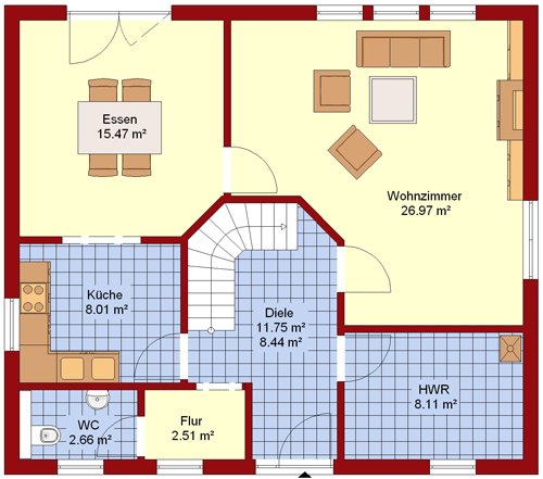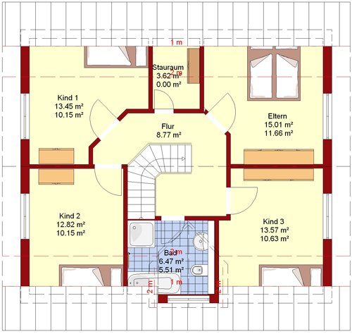 Der Entwurf - Fit for Five - ist der perfekte Grundriss für eine fünfköpfige Familie. Im Dachgeschoss befinden sich trotz der vier Schlafzimmer ein zusätzlicher Abstellraum und ein geräumiges Badezimmer.