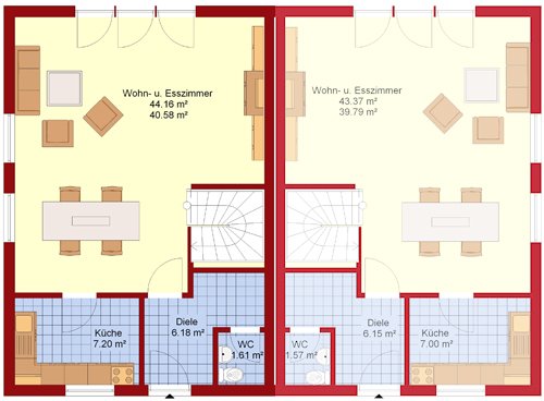 Im Erdgeschoss spielt sich das ganze Familienleben im Wohn- und Essbereich ab, denn von diesem Raum gelangt man in die Küche und das Dachgeschoss. Perfekt wird dieses Geschoss mit dem Gäste-WC und der Diele, wo problemlos die Garderobe untergebracht werden kann.