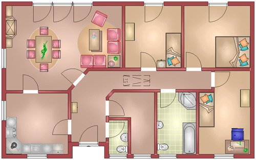 Das Erdgeschoss ist sehr praktisch aufgeteilt, von der Diele aus können das Gäste-WC und das Arbeitszimmer oder der Hauswirtschaftsraum betreten werden. Vom Wohnzimmer aus gelangt man zur Küche und zum überdachten Freisitz, der bei jedem Wetter genutzt werden kann.